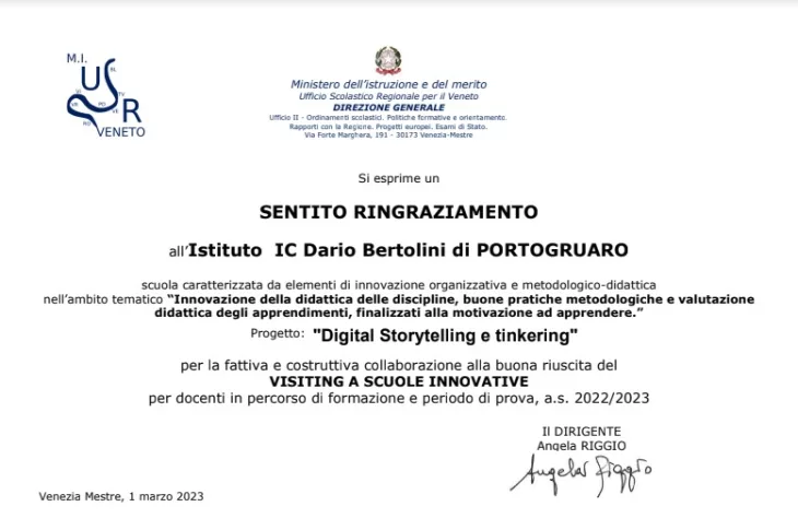 L’Istituto Comprensivo “Dario Bertolini” di Portogruaro ha ricevuto l’attestato “Visiting a Scuole Innovative”.